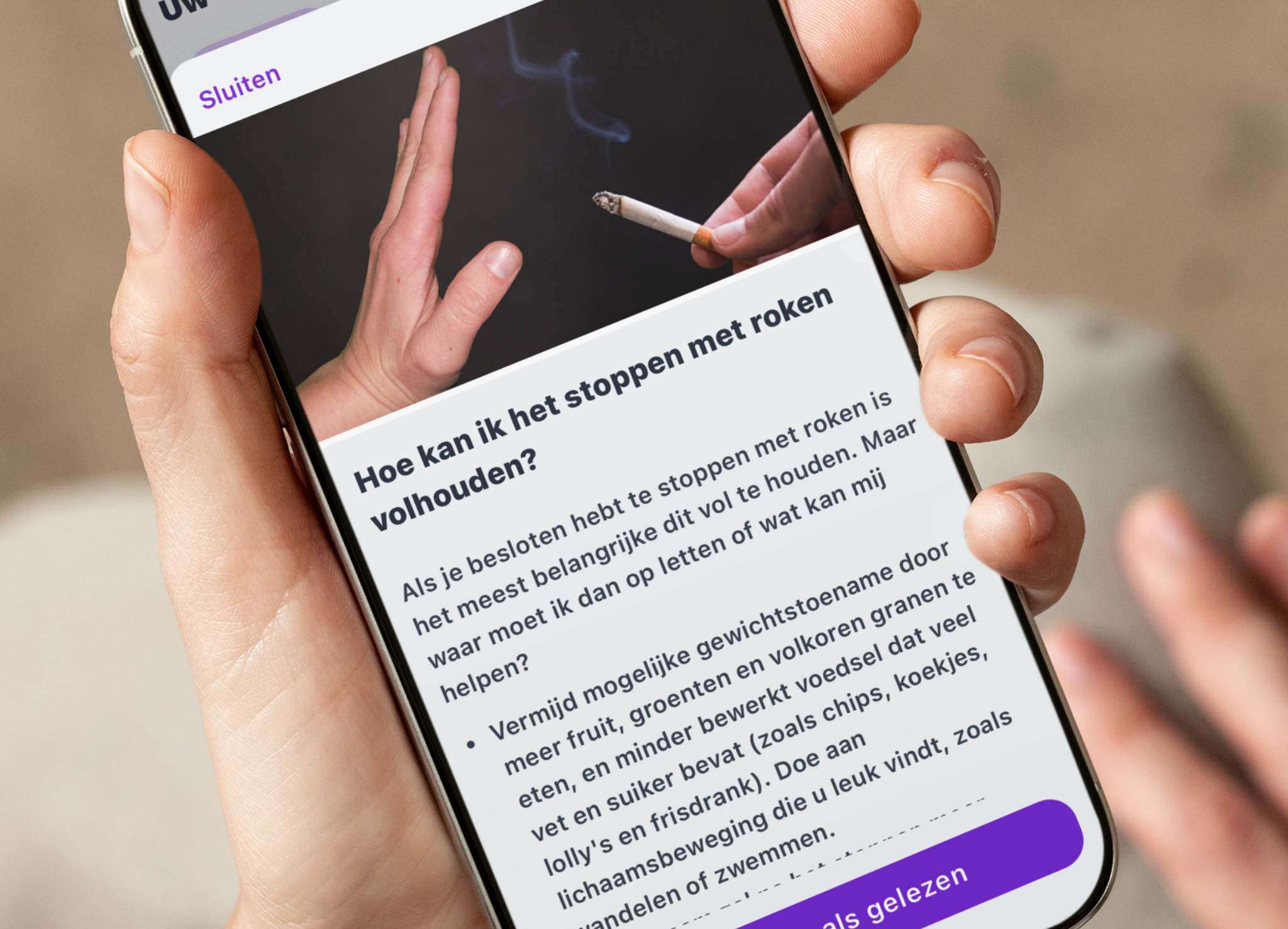Als de cliënt rookt, monitor je eenvoudig het rookgedrag. Via het dashboard deel je tips en artikelen die handvatten en inzicht geven bij het stoppen met roken.