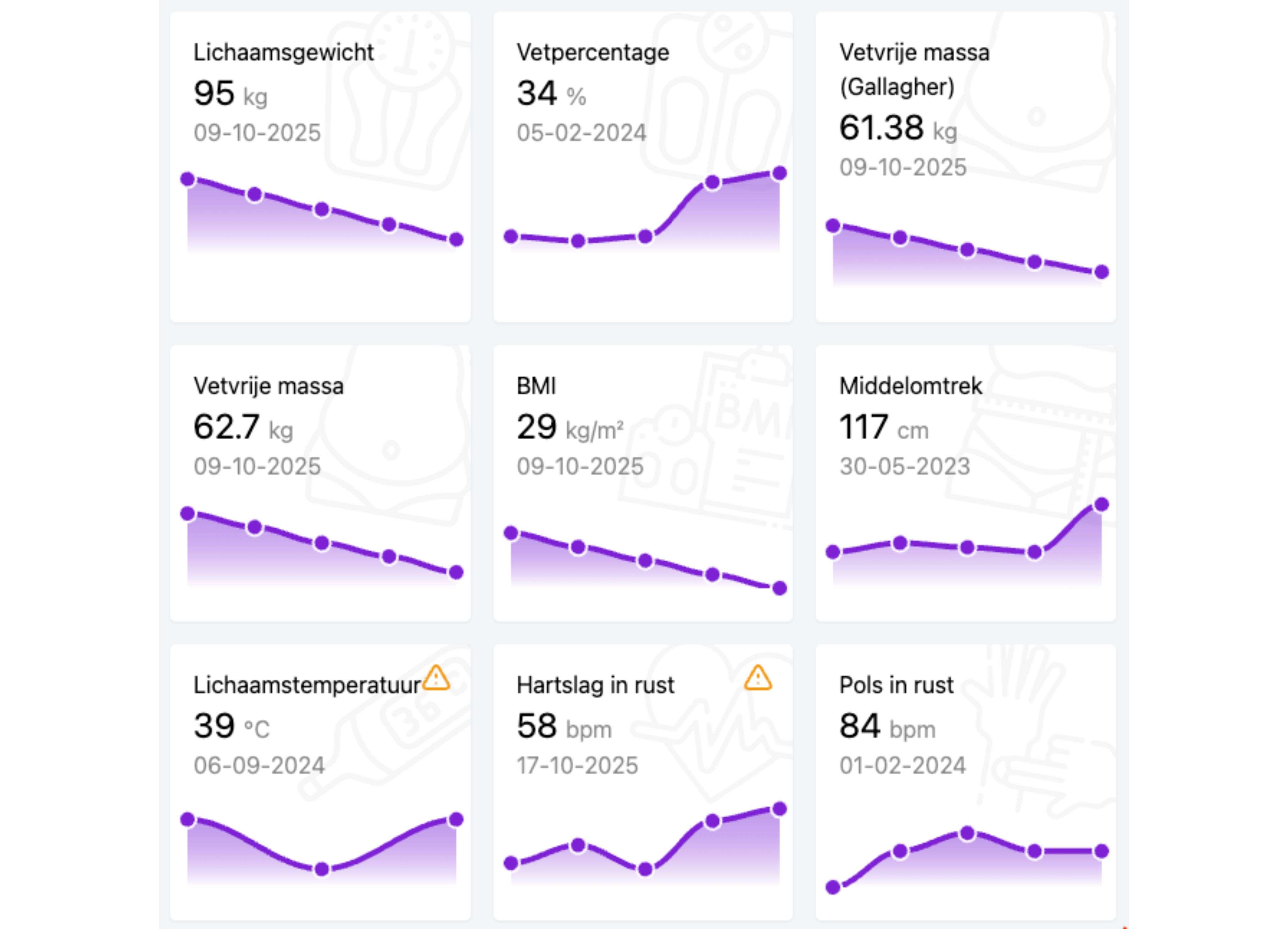 Zeker. Nieuwe of openstaande vragenlijsten en afwijkende biometrische, cardiovasculaire of respiratoire metingen verschijnen automatisch in het dashboard. Desgewenst kunt u notificaties instellen of specifieke grafieken activeren.
